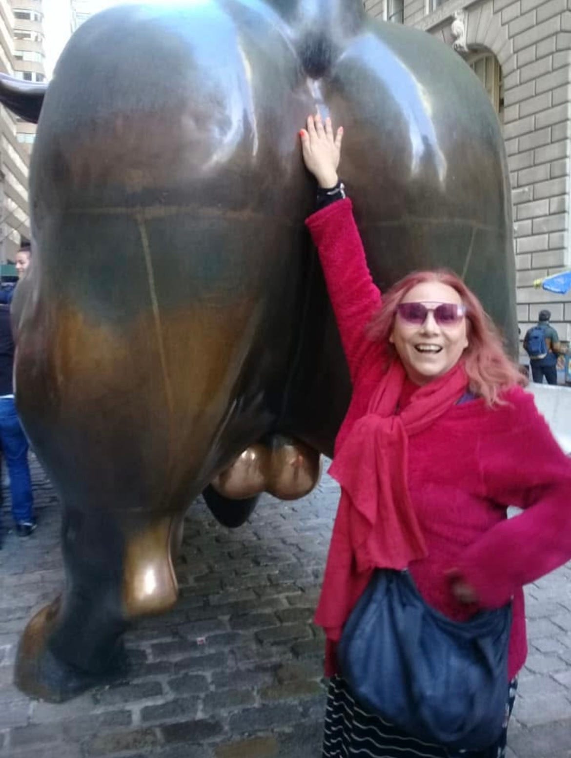 She wanted to go downtown and see the Statue of Liberty, and as we walked, she stopped at the Wall Street bull, that emblem of American greed, to touch not its balls—as all the tourists were—but its asshole, “quiro una foto con el poto,” she said.