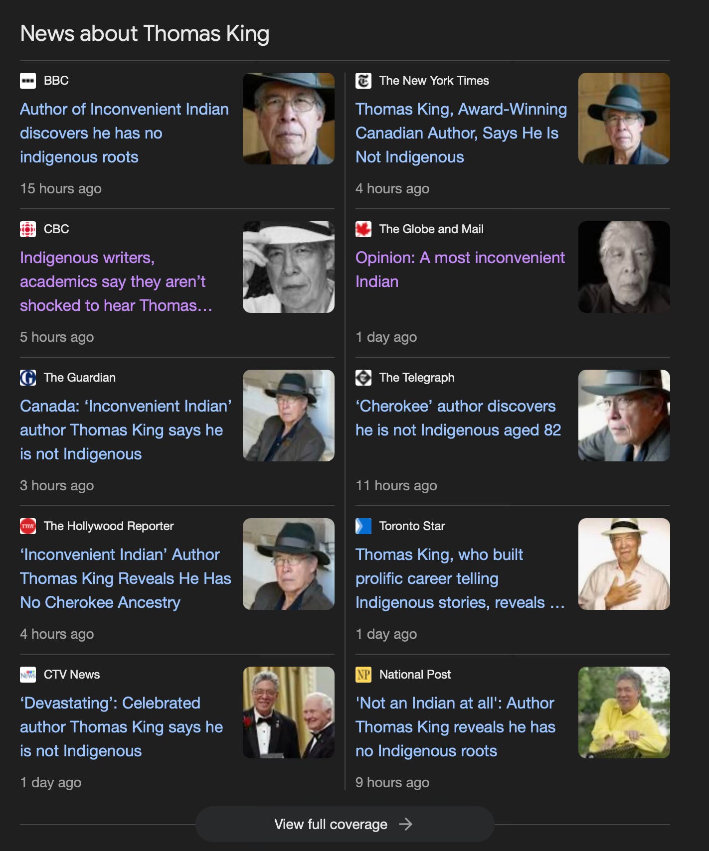 He tries to spin the devastation into the ultimate aspect of his “inconvenient” Indianness, as if his not being Indian was part of a lifelong performance behind which there is no truth, and that to fruitlessly search for that truth is somehow part of a grand scheme by which the meaning of stories is revealed to be…all just a matter of perspective. It is not inconvenient to search for truth. But it is inconvenient for us to have to deal with people like him. People who have made a living off the grift of playing Indian for profit. For laughs. For a sense of belonging to a story bigger than oneself. A story that is made up, stretched beyond all belief. And yet, people believe. Readers believe. Prize committees believe. Tenure review boards and university administrators and students and colleagues and young people just trying to get by. Yes, they believe that someone like them could make a life out of telling our stories.